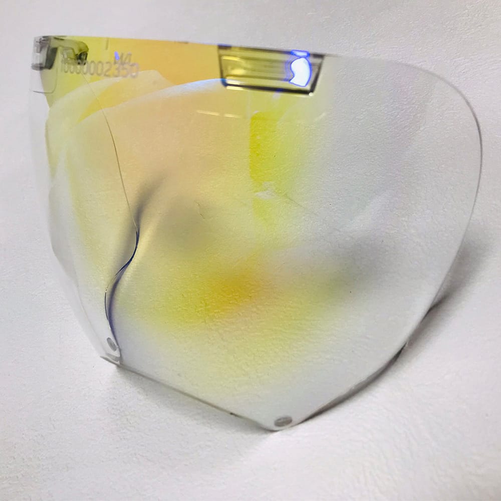All outsert lenses for the MSA Millennium have 3D curved surface. Due to this, it is very difficult to realize a half-mirror-finishing. We have adopted a new processing method to achieve this half-mirror-finish.